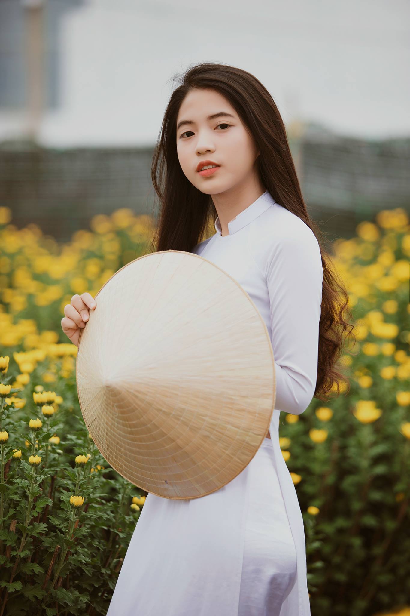Thiếu nữ khoe sắc bên vườn hoa cúc. (Ảnh: Huỳnh Long Thành)