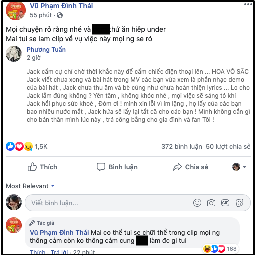 Khi lùm xùm về mối quan hệ bất hòa giữa Jack và K-ICM chưa có dấu hiệu 'hạ nhiệt' thì mới đây Thái Vũ FAPtv - một người anh thân thiết với Jack đã ẩn ý lên tiếng. Theo đó trên trang cá nhân, Thái Vũ chia sẻ lại bài đăng của Jack kèm dòng trạng thái: “Mọi chuyện rõ ràng nhé, mai tui sẽ làm clip về vụ việc này, mọi người sẽ rõ”.