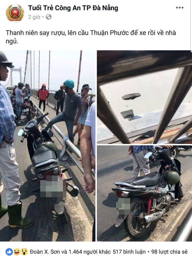 Theo đó, sự việc hi hữu này được cho là xảy ra khoảng 14 giờ ngày 22/4. Thời điểm này, người dân lưu thông qua cầu Thuận Phước (Đà Nẵng) tá hỏa khi phát hiện 1 chiếc xe máy còn cắm nguyên chìa khóa xe cùng đôi dép để lại trên cầu. Nghi ngờ có chuyện chẳng lành nên mọi người đã gọi cho lực lượng chức năng, đồng thời chia sẻ lên các trang mạng xã hội để tìm kiếm người thân của chủ nhân chiếc xe máy.