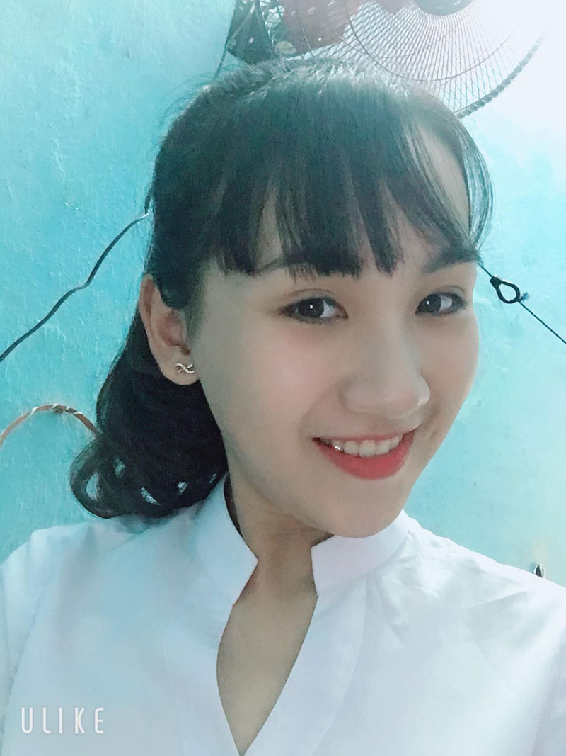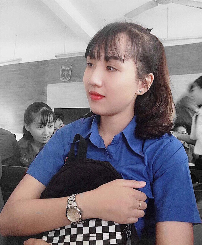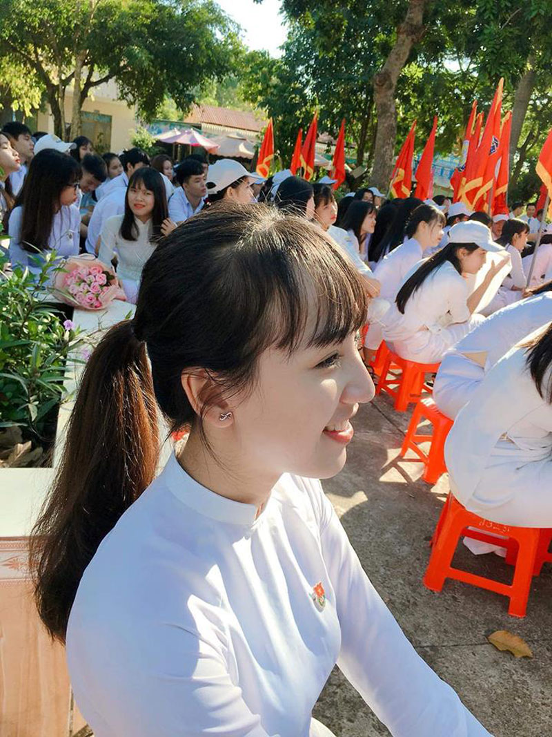 Trong bức ảnh được chia sẻ trên diễn đàn đông thành viên, Đài Trang mặc trang phục áo dài, bên ngực trái đeo huy hiệu đoàn. Cô nàng cột tóc lên cao. Với góc chụp nghiêng, cô bạn quê Bình Phước khiến bất cứ ai cũng phải xuýt xoa trước sống mũi cao thẳng, nụ cười tỏa nắng và nước da trắng hồng.