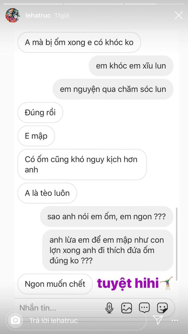 Và mới đây, couple này lại tiếp tục khiến dân tình “gato ngập mặt” bởi loạt tin nhắn tình bể bình. Theo đó, thông qua tính năng story trên Instagram, Hà Trúc đã chia sẻ hình ảnh đoạn hội thoại với nội dung vô cùng mùi mẫn. Dù không tiết lộ cụ thể danh tính của nửa kia nhưng khỏi cần nói thì dân tình cũng biết tỏng là ai rồi. Có thể thấy dù người yêu mới chỉ đặt tình huống giả định là bị bệnh thôi mà cô nàng blogger xinh đẹp đã muốn khóc xỉu luôn rồi.