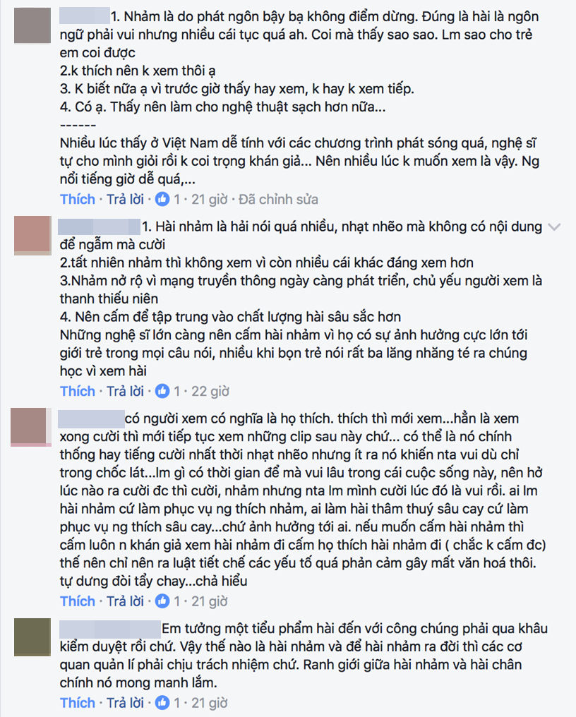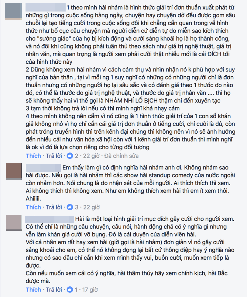 Trên trang mạng xã hội, chúng tôi có mở một “diễn đàn” nho nhỏ để thăm dò ý kiến khán giả về vấn đề “hài nhảm”. Có 4 câu hỏi được đưa ra gồm: “Thế nào là hài nhảm? Bạn có xem hài nhảm không? Vì sao? Tại sao hài nhảm vẫn nở rộ và liên tục “phát triển”? Có nên cấm hài nhảm không? (Vai trò của cơ quan quản lý, bầu sô, đài truyền hình, các tụ điểm… đối với vấn đề này như thế nào?)