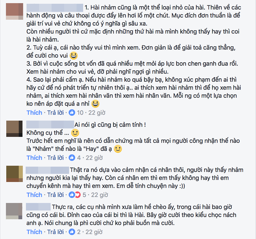 Bên cạnh đó, cũng nhiều ý kiến cho rằng, nếu chỉ đơn thuần cần tiếng cười mà không cần phải suy nghĩ, sau một ngày lao động mệt nhọc, thì “hài nhảm” vẫn đáng xem.