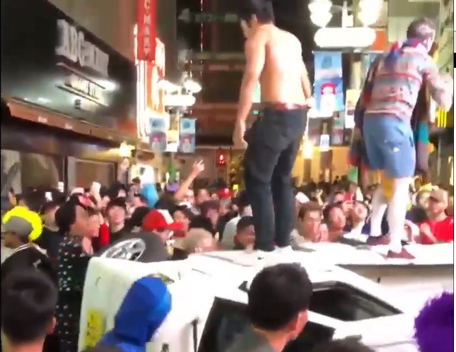 Đám đông hò nhau lật đổ chiếc xe tải ở khu phố Shibuya.