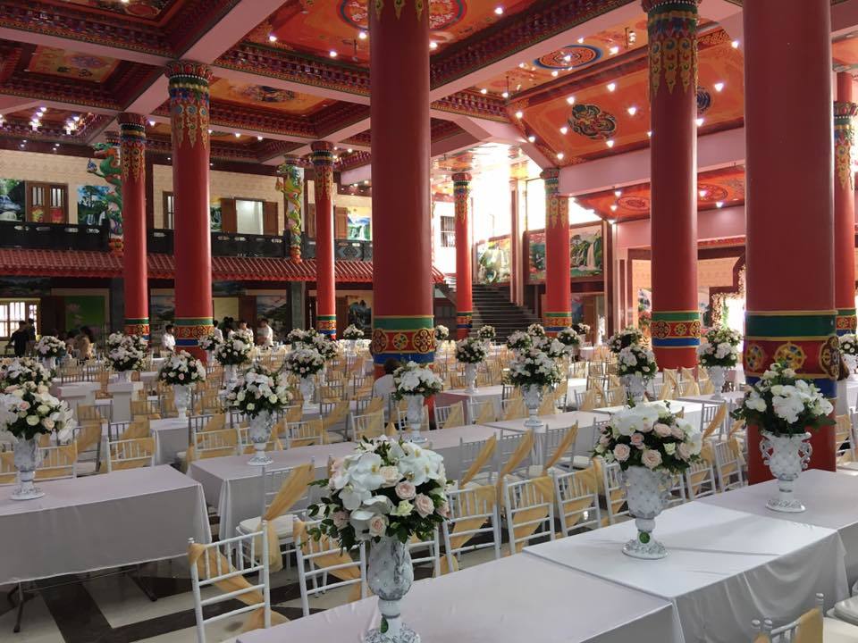 Không gian tiệc cưới như lâu đài đều được trang trí bằng 100% hoa tươi gồm có 10 nghìn bông hoa hồng trắng nhập khẩu, 6 nghìn cành cẩm tú cầu, 3.000 cành lan hồ điệp trắng và vô số những loài hoa khác, được chuẩn dàn dựng trong vòng 10 ngày đêm.Tất cả chi phí cho việc dựng rạp, hoa trang trí, phông bạt, hệ thống ánh sáng sân khấu… ước tính lên tới hơn 2 tỉ đồng.