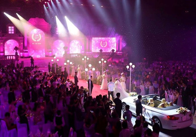 Toàn bộ không gian tiệc cưới được mô phỏng như một đêm đại nhạc hội, được trang trí bằng hoa tươi, trong hội trường cưới còn xuất hiện cả chiếc ô tô mui trần hiệu BMW, chiếc xe chú rể đã dùng để đón cô dâu ra phía trước hội trường cưới.