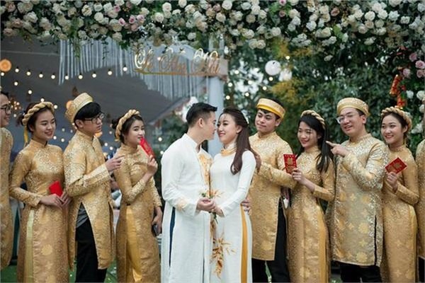 Về phần trang phục cũng được đầu tư mức “khủng”. Ở lễ ăn hỏi, áo dài cô dâu cùng áo dài người thân được thiết kế thêu tay cầu kì từng đường kim, mũi chỉ với tổng chi phí cho khoản này là 400 triệu. Đồng thời chiếc váy cô dâu mang thương hiệu nổi tiếng cũng có giá khoảng 160 triệu.