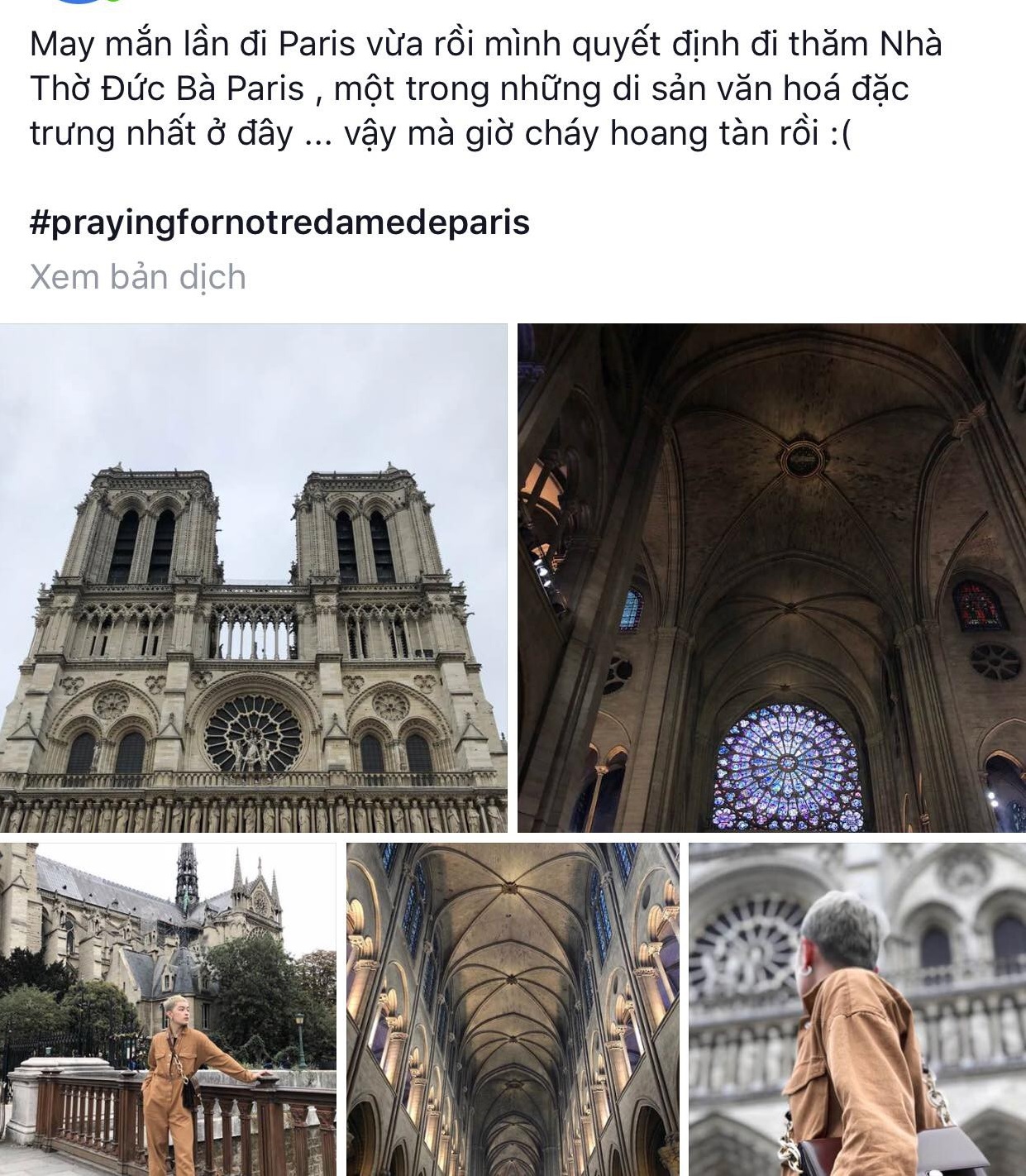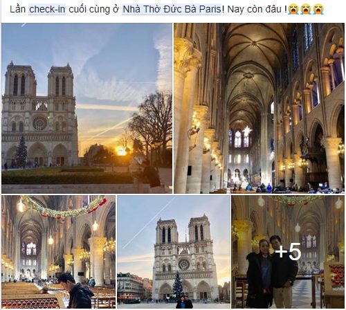 Chính vì thế, sau khi thông tin vụ cháy được lan truyền, không chỉ người dân nước Pháp mà toàn thể thế giới đều sửng sốt và bàng hoàng. Hàng loạt bạn trẻ Việt Nam, những người đã đến và sống tại Pháp đăng tải trên trang cá nhân những hình ảnh check-in cùng với nhà thờ Đức Bà Paris kèm những dòng trạng thái vô cùng tiếc nuối, buồn bã trước sự kiện công trình kiến trúc thế kỷ bị cháy.