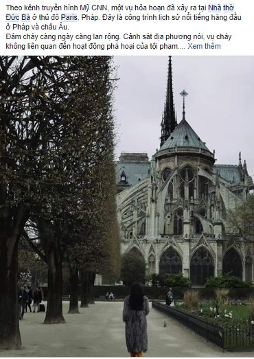Khoảng 18h50 ngày 15/4 (23h50 giờ Hà Nội) Nhà thờ Đức Bà ở thủ đô Paris của Pháp đã xảy ra một vụ cháy nghiêm trọng kéo dài hơn 8 tiếng, khói lớn bao trùm khiến tháp nhọn và phần lớn mái vòm nhà thờ đổ sập, gây thiệt hại cho cấu trúc nhà thờ. Nhà thờ Đức Bà tồn tại đến nay gần 900 năm, đây được cho là trái tim, là linh hồn của nước Pháp nói chung và đặc biệt của người theo đạo Công Giáo nói riêng.