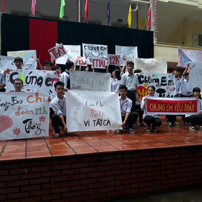Kèm theo lời chia sẻ là những hình ảnh hàng trăm học sinh của trường tập trung lại, xếp hàng ngay ngắn chia tay thầy. Nhiều học sinh mang theo những băng rôn, biểu ngữ để thể hiện tình cảm với người thầy của mình. “Chúng em yêu thầy”, “Cảm ơn thầy vì tất cả” là những lời nhắn nhủ ngọt ngào, đầy tình cảm mà học sinh đã viết lên để chia tay người hiệu trưởng.