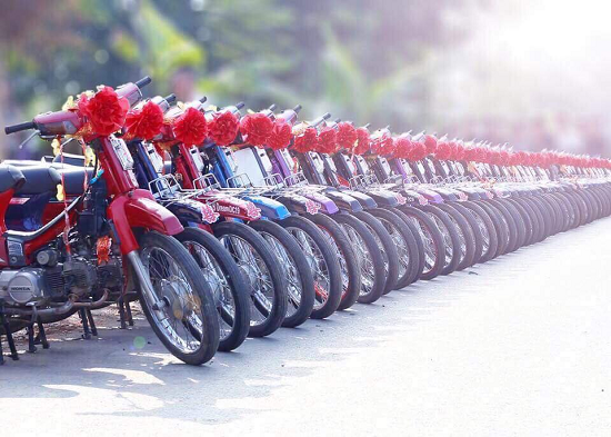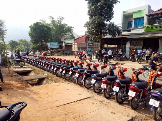 100 chiếc xe Dream được xếp thẳng hàng ngay ngắn trên đường, đầu xe thắt nơ đỏ gây sự chú ý với hàng trăm người dân xã Thu Cúc.