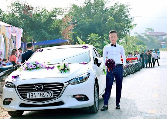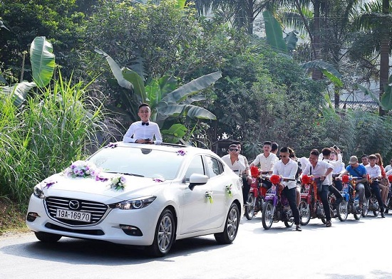 Đi đầu đoàn rước dâu là chiếc xe của chú rể Hoàng Rim và theo sau là 100 chiếc xe hiệu Dream thắt nơ đỏ, nối đuôi nhau thành hàng dài trông rất ấn tượng.