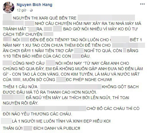 Trong bài viết, Hằng Túi không ngại ngần xưng hô “mày - tao'” với vợ chồng Đăng Nguyên. Điều đáng nói, ngay sau đó, “hot mom” đăng 1 bài viết khác giải thích lý do khiến mình tức giận phải mắng chửi Xari trên mạng xã hội. Theo Hằng Túi chia sẻ, cô đồng ý cho Đăng Nguyên đưa 2 bé Su, Sóc về chơi với bố nhưng Xari đã có hành động và lời nói không đúng mực với con riêng của chồng.