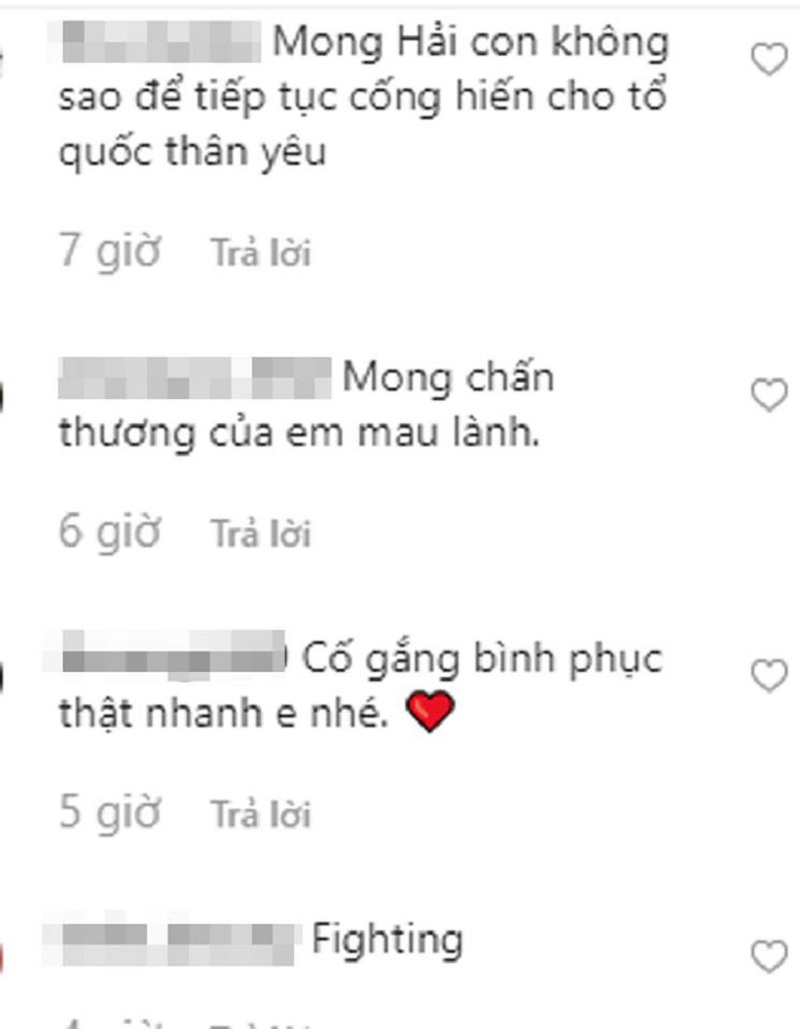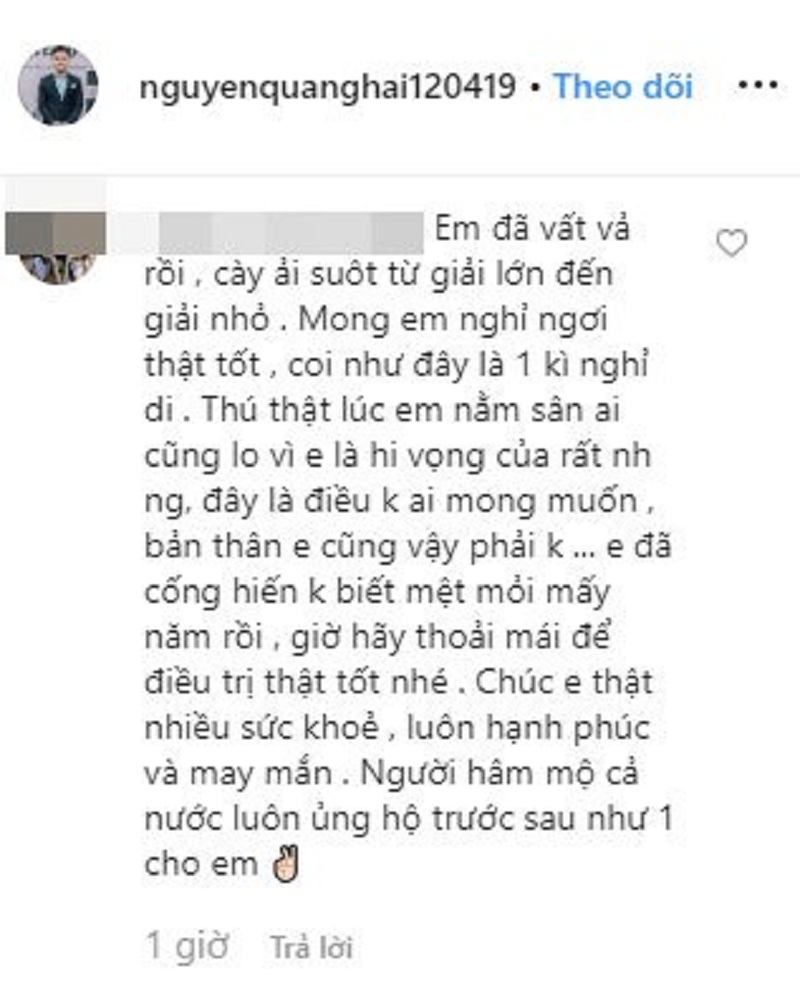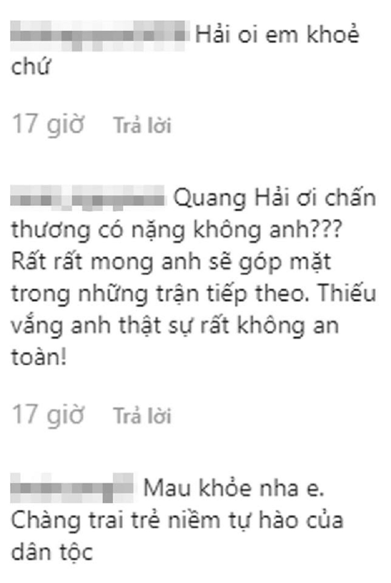 Trước thông tin này, nhiều người hâm mộ đã vào trang cá nhân của Quang Hải và để lại những lời động viên, cổ vũ anh trong những bài đăng. “Cầu mong chấn thương của em sẽ nhẹ nhất có thể, và chúc em bình phục sớm nhất có thể để tiếp tục cống hiến cho đội tuyển” - tài khoản Nhung Trịnh viết.