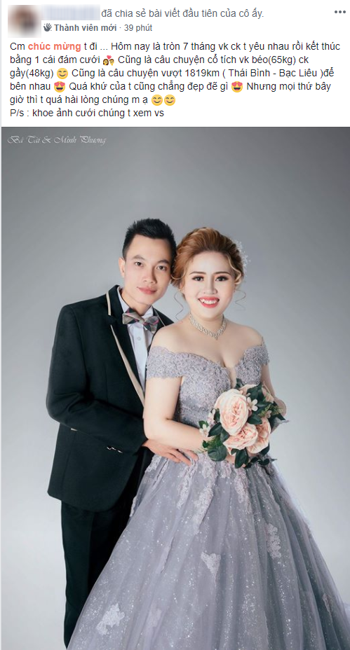 Tài khoản P.M viết: “Hôm nay là tròn 7 tháng vợ chồng mình yêu nhau và kết thúc bằng 1 đám cưới. Cũng là câu chuyện cổ tích vợ béo (65 kg), chồng gầy (48 kg), cũng là câu chuyện vượt 1.819 km (Thái Bình - Bạc Liêu) để bên nhau. Quá khứ của mình không đẹp đẽ gì nhưng bây giờ mọi thứ, mình quá hài lòng mọi người ạ!”.
