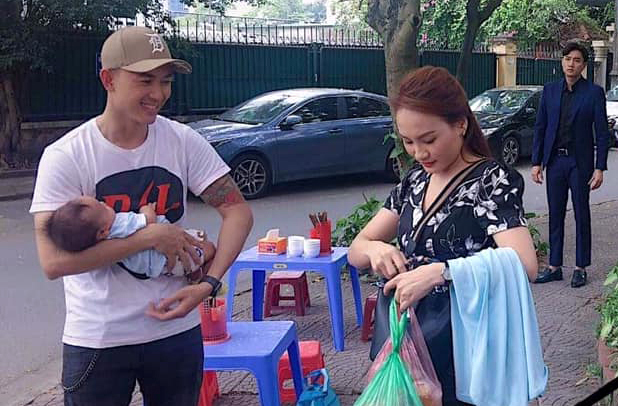 Trong clip hậu trường này, Dũng mang ô che cho mẹ con Thư, trong khi đó, Thư mặc váy hoa khá xinh, tâm trạng cũng rất vui vẻ, thoải mái. Cả hai chọn một quán bắp nướng lề đường để ngồi chơi. Sau đó, Dũng còn đề nghị được bế Củ Gừng.