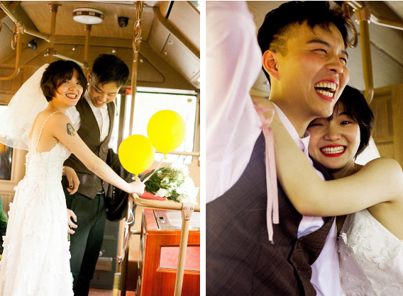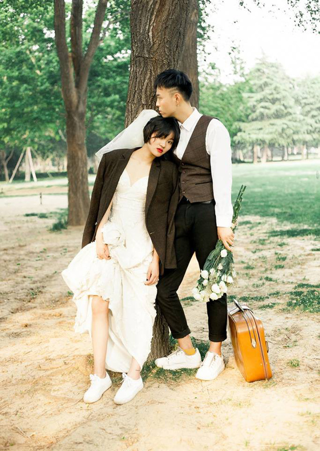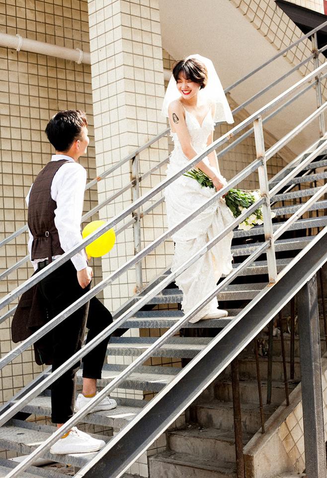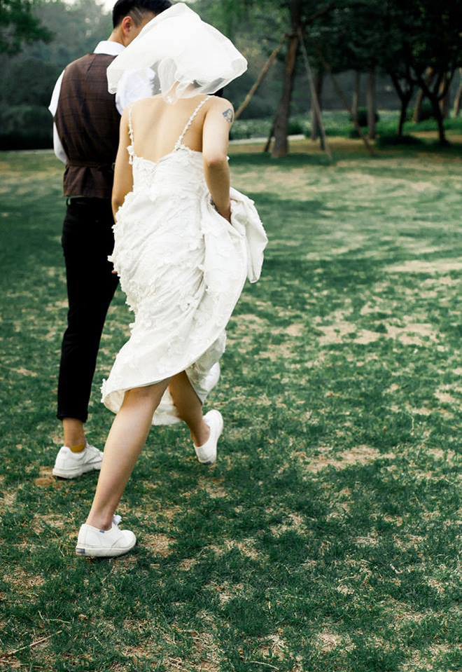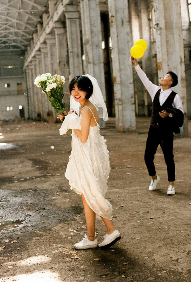 Nét hiện đại tiếp theo trong bộ ảnh cưới chụp máy phim này đó là trang phục có chút phá cách của cô dâu chú rể. Chú rể tóc undercut siêu ngầu; cô dâu tóc ngắn để tự nhiên, đội khăn voan cô dâu. Chú rể vẫn mặc sơ mi trắng nhưng không đóng nguyên bộ vest mà diện áo gile trẻ trung. Cô dâu trên cánh tay có một hình xăm, mặc váy trắng hai dây dáng dài nhưng liên tục kéo váy lên để… khoe đôi giày thể thao trắng cực chất, cũng là giày đôi với chú rể. Cặp đôi này chỉ vừa xuất hiện trong trang phục như vậy đã tạo cảm giác rất trẻ, rất vui, rất nghịch ngợm rồi!