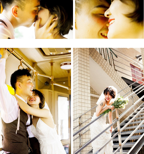 Yếu tố thứ ba khiến bộ ảnh cưới này tạo được thiện cảm với nhiều người, đó là những background tự nhiên được ekip lựa chọn. Cặp đôi trong ảnh trông không giống đang chụp ảnh cưới mà chỉ đang cùng dạo chơi, vui đùa. Họ chụp ảnh ở ga tàu điện bỏ hoang, trên đồi, trong tiệm băng đĩa nhạc, trước xe bán trái cây dạo,…