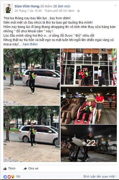 Trước thềm liveshow Sài Gòn Bolero và Hưng vào năm ngoái, trên trang cá nhân của mình, nam ca sĩ đã chia sẻ những hình ảnh chọn mua ghế massage tại showroom Kingsport Nam Sài Gòn. Đàm Vĩnh Hưng cho biết, để có thể làm việc với cường độ liên tục như “siêu nhân” thì ngoài ăn uống, nghỉ ngơi hợp lý anh cần phải có thêm một chiếc ghế massage để xua tan mệt mỏi, uể oải để có đủ năng lượng cho những dự án mới của mình.