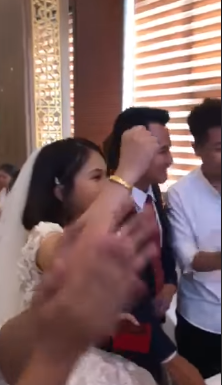 Cô dâu “cân” hết đội hình bạn lầy lội để nhận quà mừng. Ảnh cắt từ clip.