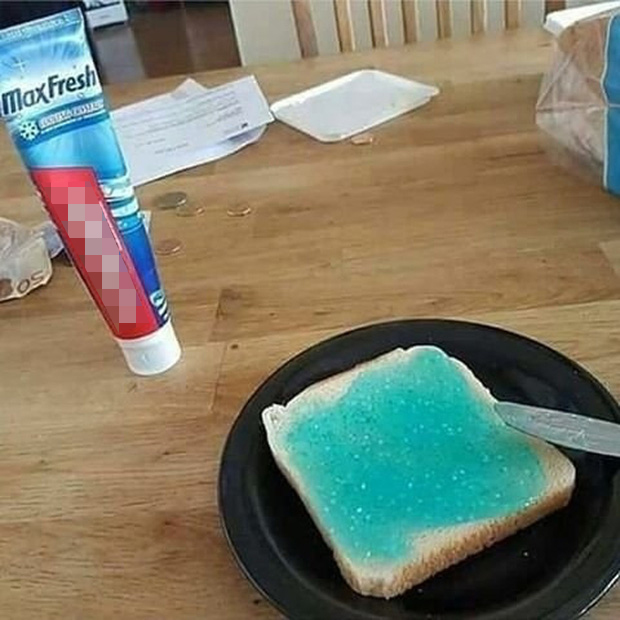Sau khi ăn xong chocopie mắm tôm thì làm thêm lát bánh mì phết kem đánh răng để răng miệng được thơm tho nhé!