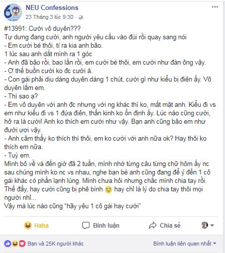 Thương em mấy núi anh cũng trèo, nhưng đã hết thương rồi thì em cười nhiều cũng khiến anh bực. Nguyên văn tâm sự của cô nàng bị bỏ vì cười nhiều như sau: