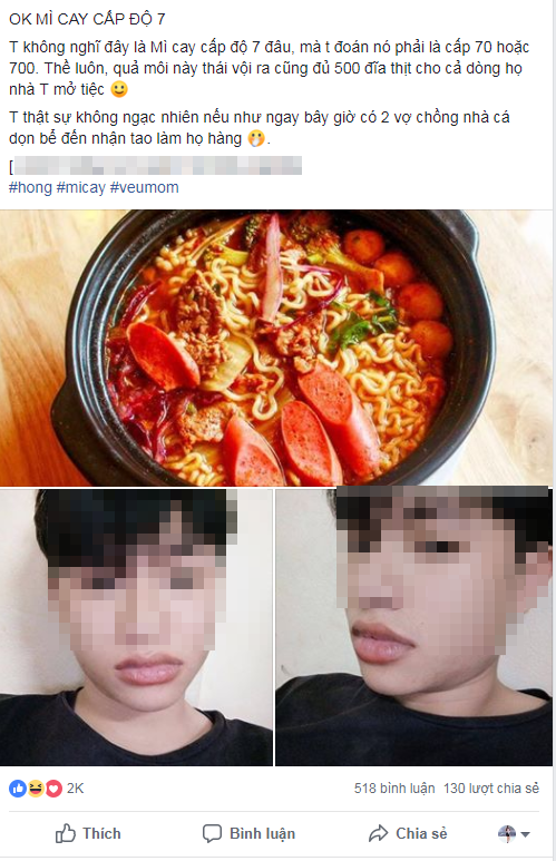 Hiện, câu chuyện này đang được dân tình like và chia sẻ mạnh trên các trang mạng xã hội. Mong rằng, anh chàng sớm lấy lại vẻ đẹp trai như ban đầu và không còn dại dột mà ăn mì cay cấp 7 nữa.