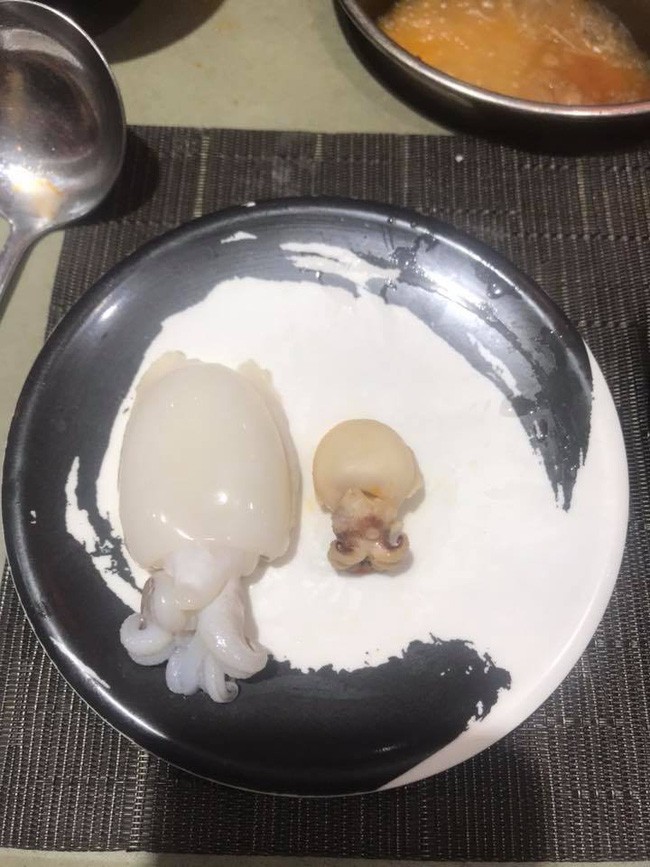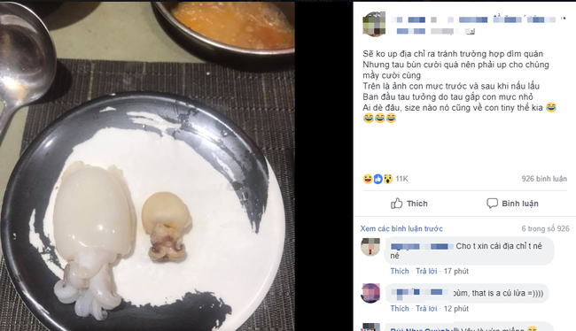 Chả là cô nàng đi ăn lẩu và hí hửng khi thấy một đĩa mực to bự được nhân viên nhà hàng đưa lên. Tuy nhiên, đời không như là mơ bởi sau khi nhúng, con mực tưởng cắn “ngập chân răng” bất ngờ ngót lại bé tí xíu. Điều này khiến chủ thớt vừa hoang mang vừa thất vọng đồng thời có chút buồn cười.