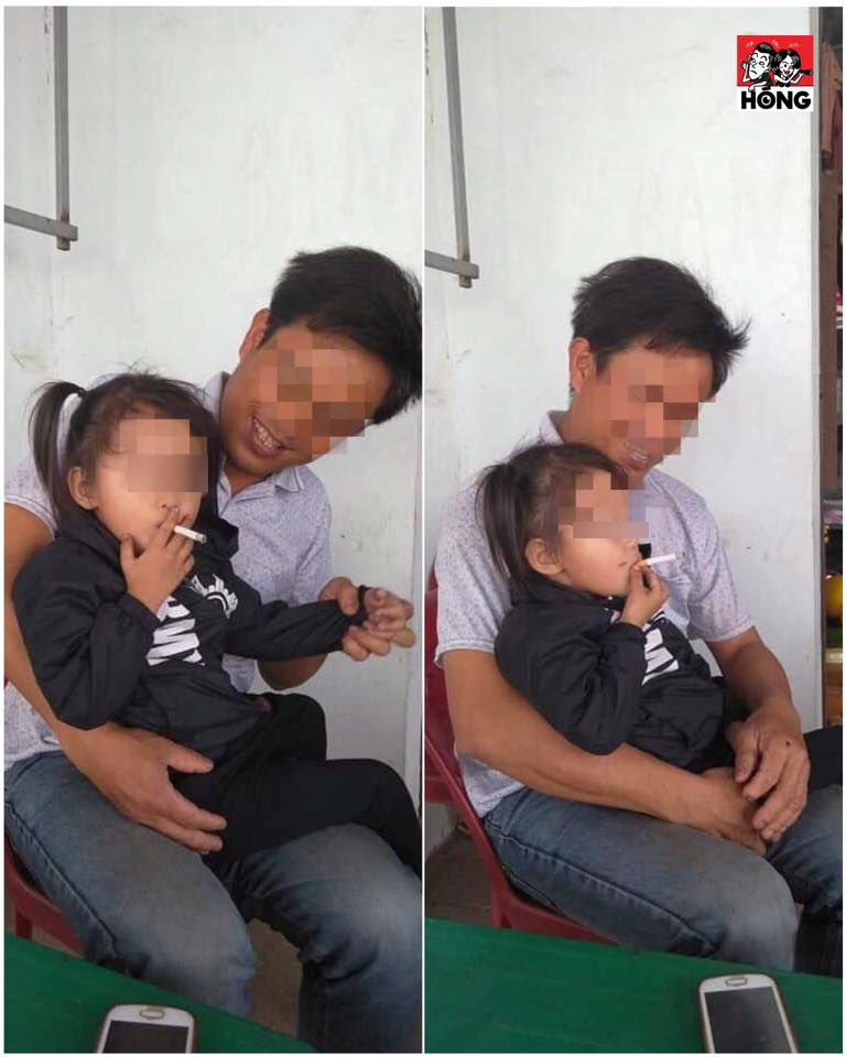 Mới đây, mạng xã hội xuất hiện hình ảnh một cô bé khá nhỏ tuổi tay cầm điếu thuốc lá đưa lên miệng hút, đáng chú ý, người đàn ông đang được cho là bố của cô bé lại tỏ ra hào hứng, miệng cười vui vẻ như cổ vũ hành động này của con gái.