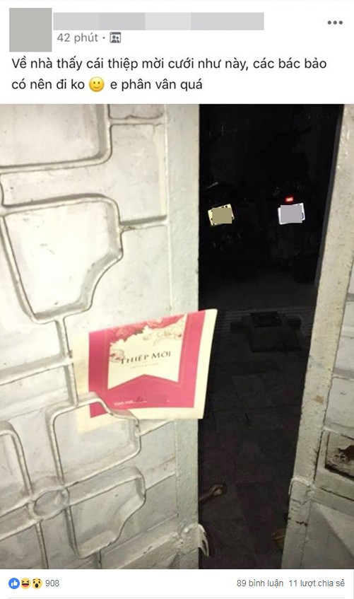 Theo hình ảnh ghi lại, chủ thớt đi làm tối về đến nhà thấy một tờ giấy màu đỏ giắt trên cửa. Ban đầu, cô tưởng là hóa đơn thu tiền điện, net hay tờ rơi nhưng chiếu đèn lại gần thì thấy thiệp cưới ghi tên mình to tướng. “Về nhà thấy cái thiệp mời cưới như thế này, các bác bảo em có nên đi không? Phân vân quá”, chủ thớt hoang mang viết.