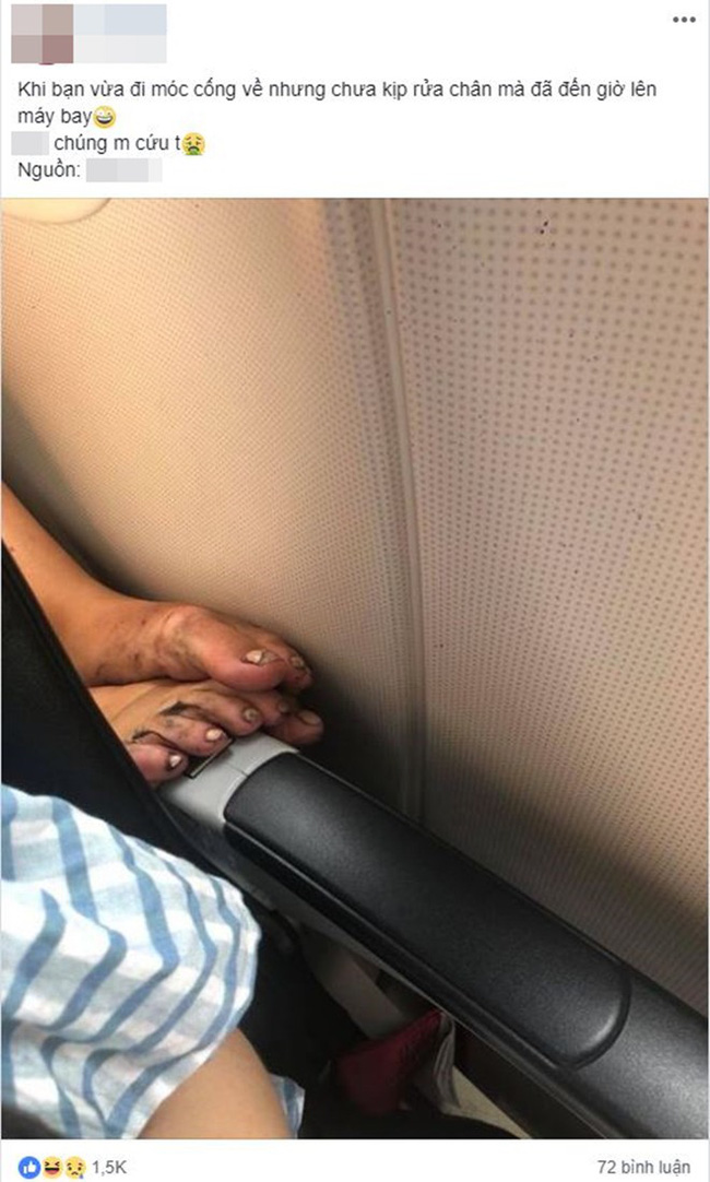 Cô gái có nickname A.H than vãn: “Khi bạn vừa đi móc cống về nhưng chưa kịp rửa chân mà đã đến giờ lên máy bay. Chúng mày cứu tao”. Kèm với bài viết là hình ảnh đôi bàn chân cáu bẩn vô tư gác lên ghế của chủ thớt.