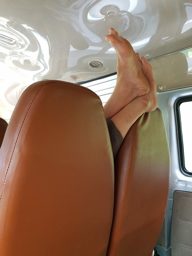 Đôi bàn chân cáu bẩn, bốc mùi gác lên ghế phía trước.