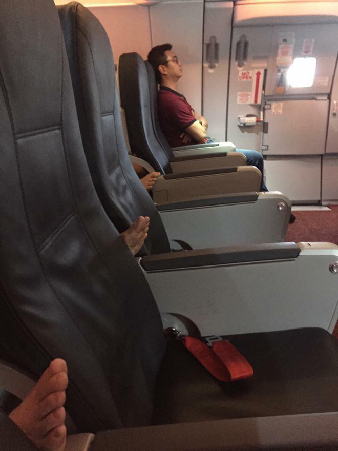 Mới đây nhất hình ảnh cô gái thản nhiên gác chân lên ghế phía trước trong máy bay khiến hành khách vô cùng khó chịu. Cô gái gặp phải tình huống này rất bức xúc khi phát hiện đôi bàn chân cáu bẩn gác lên ghế của mình. Có lẽ chuyến đi chơi bao nhiêu thích thú, hào hứng bỗng nhiên bị phá vỡ vì hành khách đồng hành kém duyên.