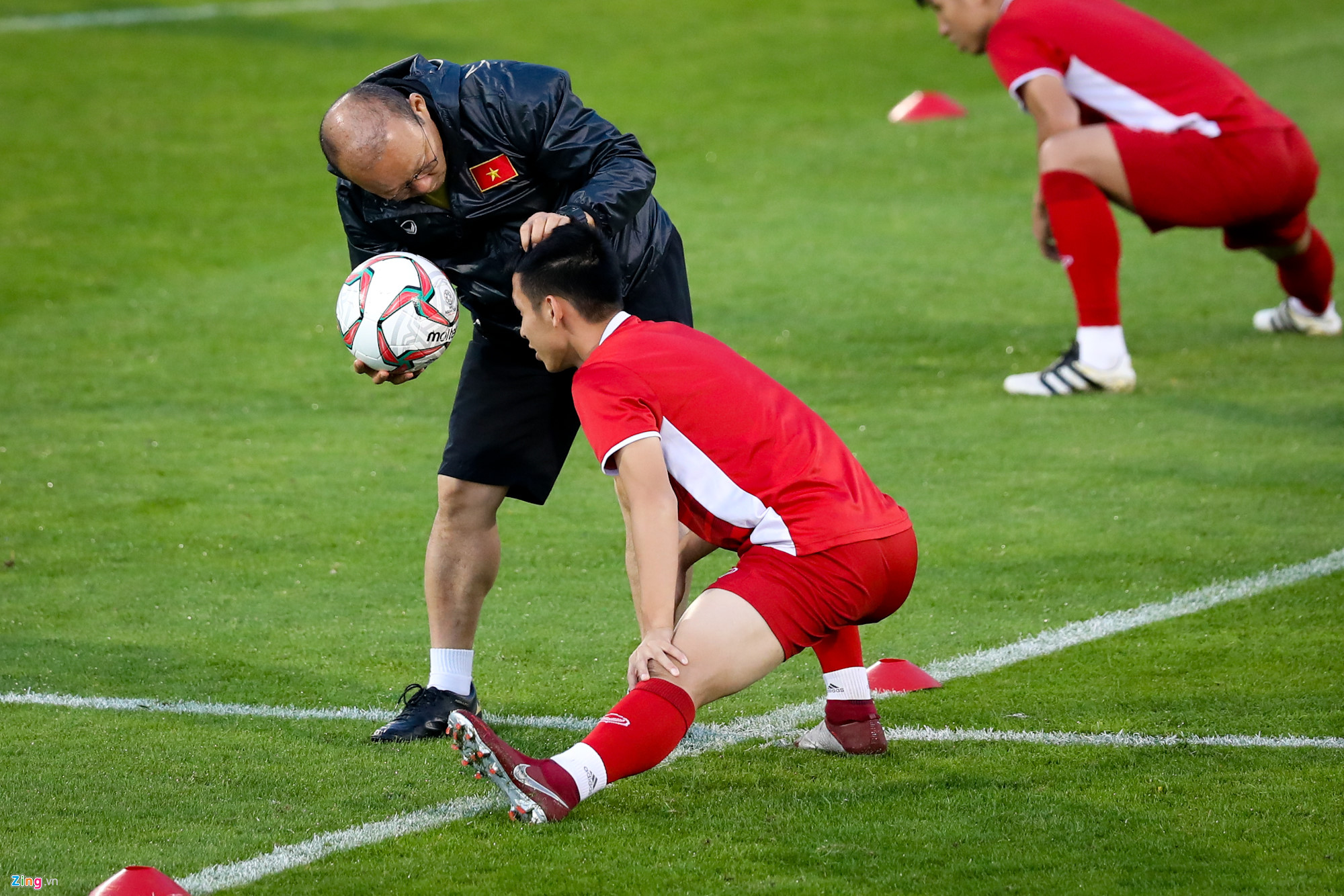 HLV Park Hang-seo xoa đầu, ân cần hỏi thăm Đỗ Hùng Dũng trong buổi tập.