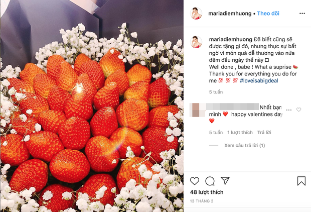 Trong ngày lễ tình nhân vào tháng 2 vừa qua, Diễm Hương cũng không ngần ngại khoe bó hoa dâu tây được bạn trai tặng.