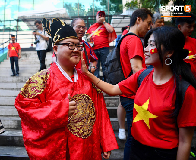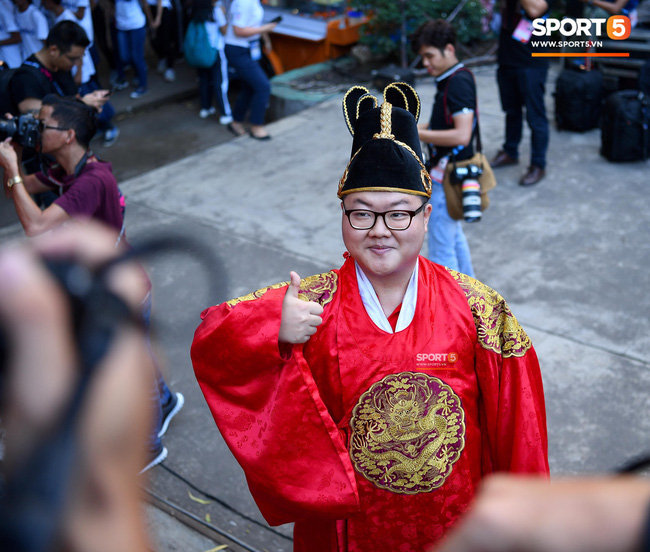 Một người hâm mộ Hàn Quốc thu hút sự chú ý bởi trang phục đặc biệt như một vị vua thời xưa. Đó là anh Kim Jong-soo, du học sinh đang học tại Bacolod (Philippines). Anh chàng được các cổ động viên Việt Nam chào đón và thể hiện sự quan tâm bằng những hành động nhỏ. Ảnh: Hiếu Lương