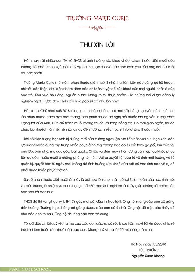 Mới đây, cộng đồng mạng xôn xao bức thư xin lỗi của thầy Hiệu trưởng trường Marie Curie (quận Nam Từ Liêm, Hà Nội). Theo đó, vào ngày 7/5, nhiều học sinh bị dị ứng thuốc diệt muỗi. Giáo viên chủ nhiệm đã phải phối hợp với các phòng ban kịp thời xử lý. Những bạn bị dị ứng đã được các nhân viên phòng Y tế của trường sơ cứu, đồng thời giáo viên chủ nhiệm báo cho các bậc CMHS. Bên cạnh đó, nhà trường cũng đã khắc phục ở những phòng học có sự cố: thay ga gối, lau cửa sổ, cửa lớp, bàn ghế, mở các cửa, bật quạt… Và đến sáng nay (8/5), học sinh đã yên tâm đến trường.
