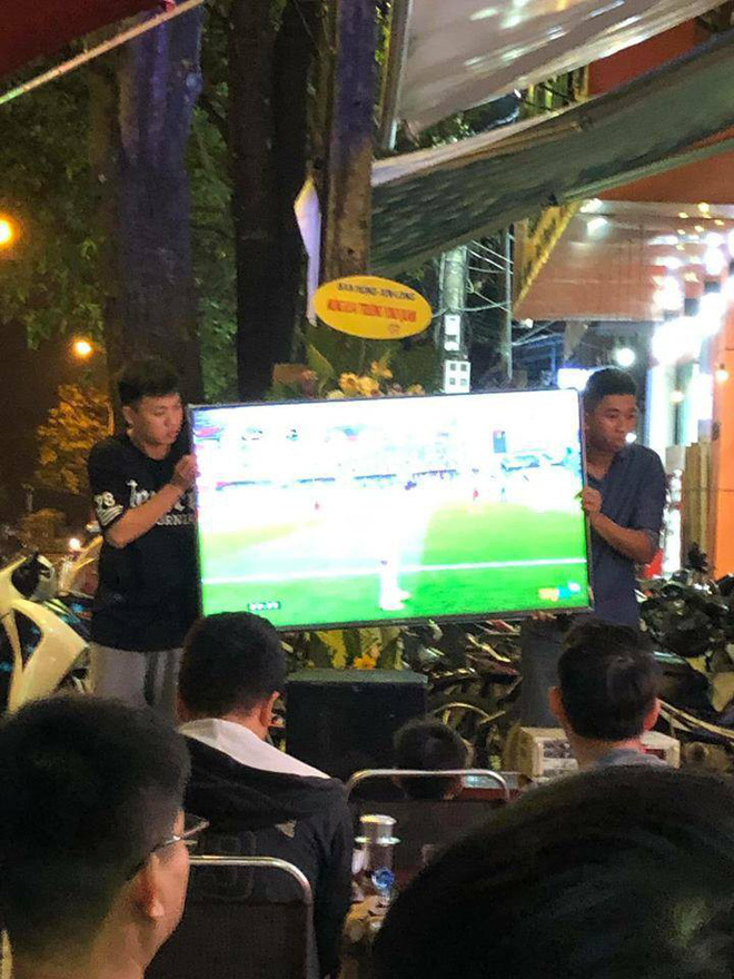 Theo đó, hai thanh niên vì loanh hoay mãi không tìm nổi cái kệ đỡ tivi phù hợp mà khách hàng cứ giục giã khi trận đấu bắt đầu. Cuối cùng bí quá nên hai chàng đành đứng bê tivi cho mọi người xem.