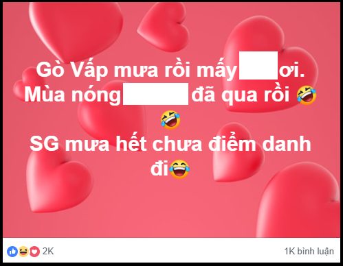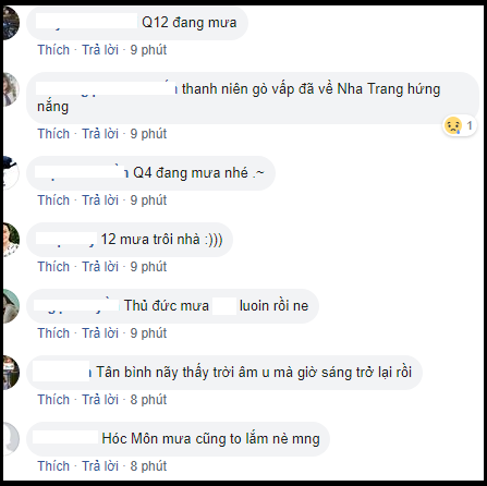 Hôm nay, ông Trời đã ”đền bù” lại bằng một cơn mưa có thể nói là phủ sóng diện rộng các quận huyện. Trên mạng xã hội, cư dân mạng liên tục cập nhật tình hình mưa tại nơi mình sinh sống. Có thể nói, hầu như các quận huyện của Sài Gòn sáng nay đều đã được ”tưới mát” bằng một cơn mưa bất chợt.