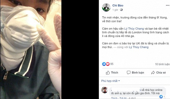 Trước đó một ngày, cũng trên Facebook cá nhân của mình, Chi Bảo động viên con “cố thủ” tại London, Anh. Nam diễn viên nhắn nhủ: “Cố thủ London! Hôm nay con trai báo chính phủ chuẩn bị kêu quân đội cách li London. Con chuẩn bị F&B như thế là ổn rồi đấy, thêm plan shipping khi cần là đủ.