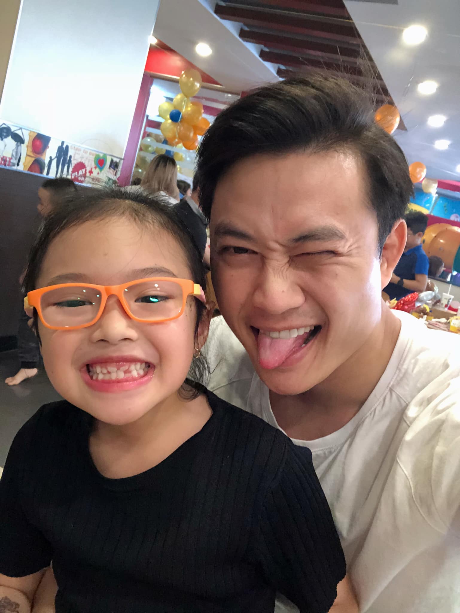 Vợ cũ anh nhận trách nhiệm nuôi con gái, anh thường xuyên đón con về nhà chơi, đưa con đi ăn uống, mua sắm và rất cưng chiều con.