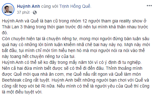 Trước đó, Hồng Quế và Huỳnh Anh đã chính thức công khai tìm hiểu sau nhiều đồn đoán về chuyện hẹn hò, nam diễn dành nhiều lời nhiều lời khen cho bà mẹ một con trên trang cá nhân của mình. Tuy nhiên vẫn chưa dám khẳng định về một mối quan hệ lâu dài do anh sắp đi tu nghiệp ở nước ngoài: “Mối quan hệ này mới bắt đầu, tụi mình chỉ mới tìm hiểu hẹn hò mà mọi người nói ra nói vào thế này toang hết chuyện riêng tư của tôi. Huỳnh Anh có thể sẽ không ở đây trong mấy năm tới vì có ý định đi tu nghiệp. Nên cả hai đứa mình biết được sẽ có thể đi đến đâu”