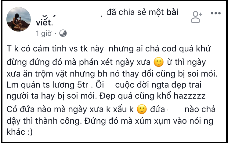 ”Ai chẳng có quá khứ. Quá khứ đó bạn có thể hút thuốc thể hiện trẻ trâu, hoặc xấu mù. Nhưng quan trọng là sau này bạn đã thay đổi, muốn tìm tình yêu thật sự cho mình. Còn việc gây chú ý thì… người trẻ nào chả muốn gây chú ý. Cứ phải nghiêm trọng phốt phốt làm gì”.