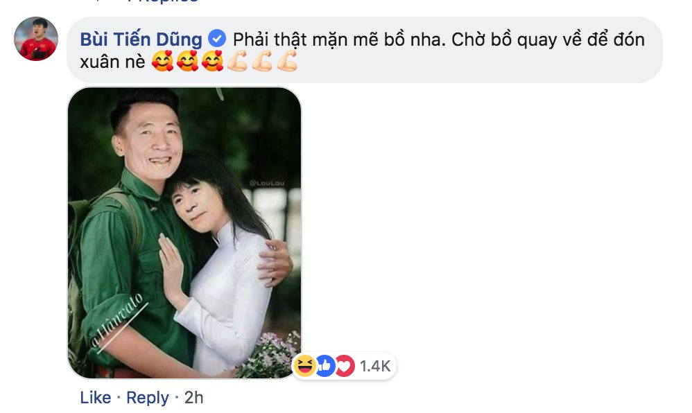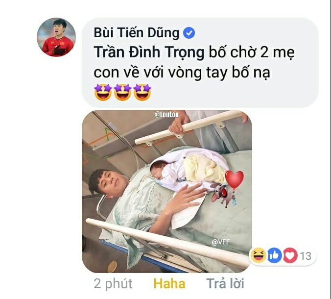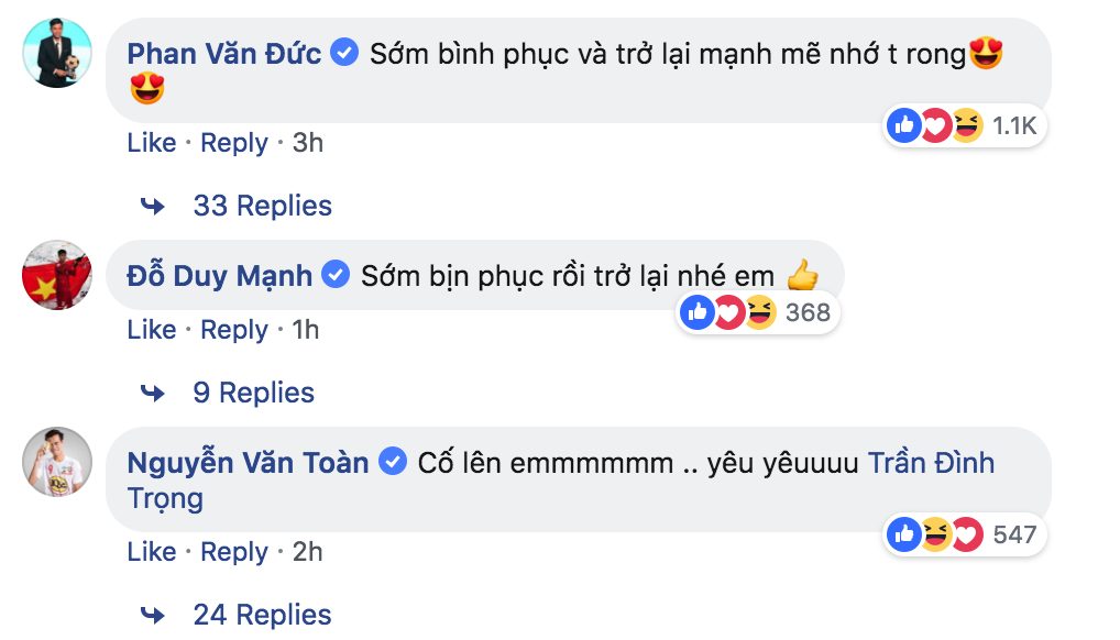 Điều người khiến hâm mộ thích thú hơn chính là niềm vui sướng của người tình tin đồn Bùi Tiến Dũng. Ngay dưới bài đăng của Đình Trọng, chàng cầu thủ số 04 ngay lập tức cùng đồng đội để lại lời chúc mừng, động viên.