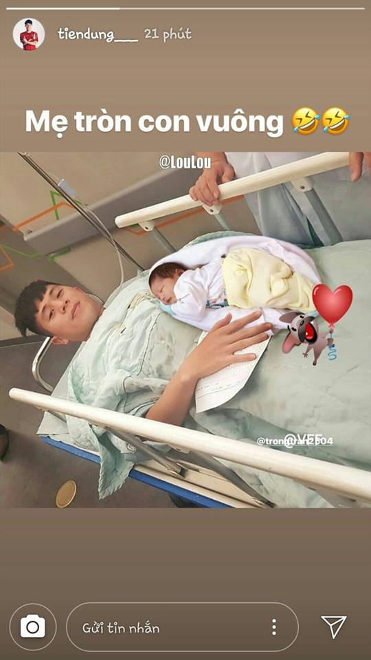 Chết cười hơn là anh chàng này còn ghép mình Đình Trọng ôm 1 em bé sơ sinh cùng dòng cap: “Bố chờ hai mẹ con về..”