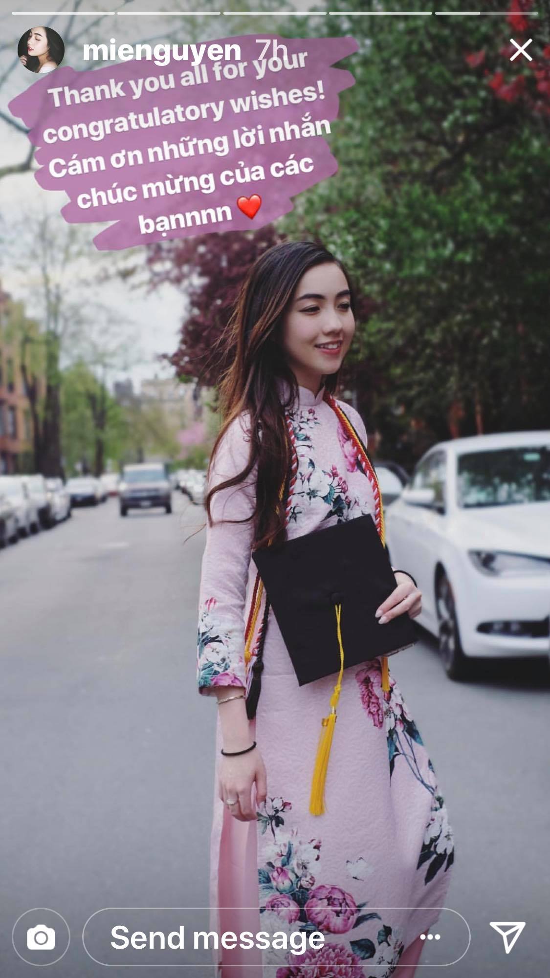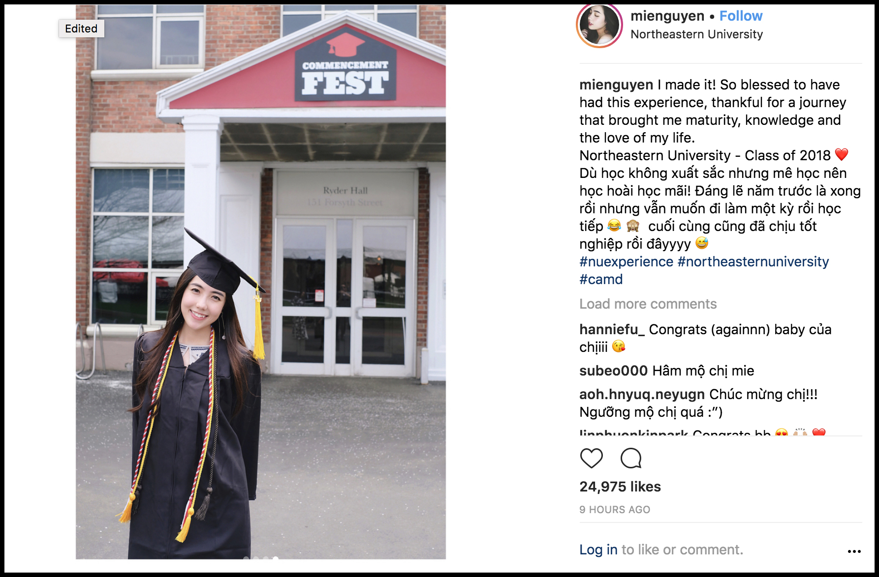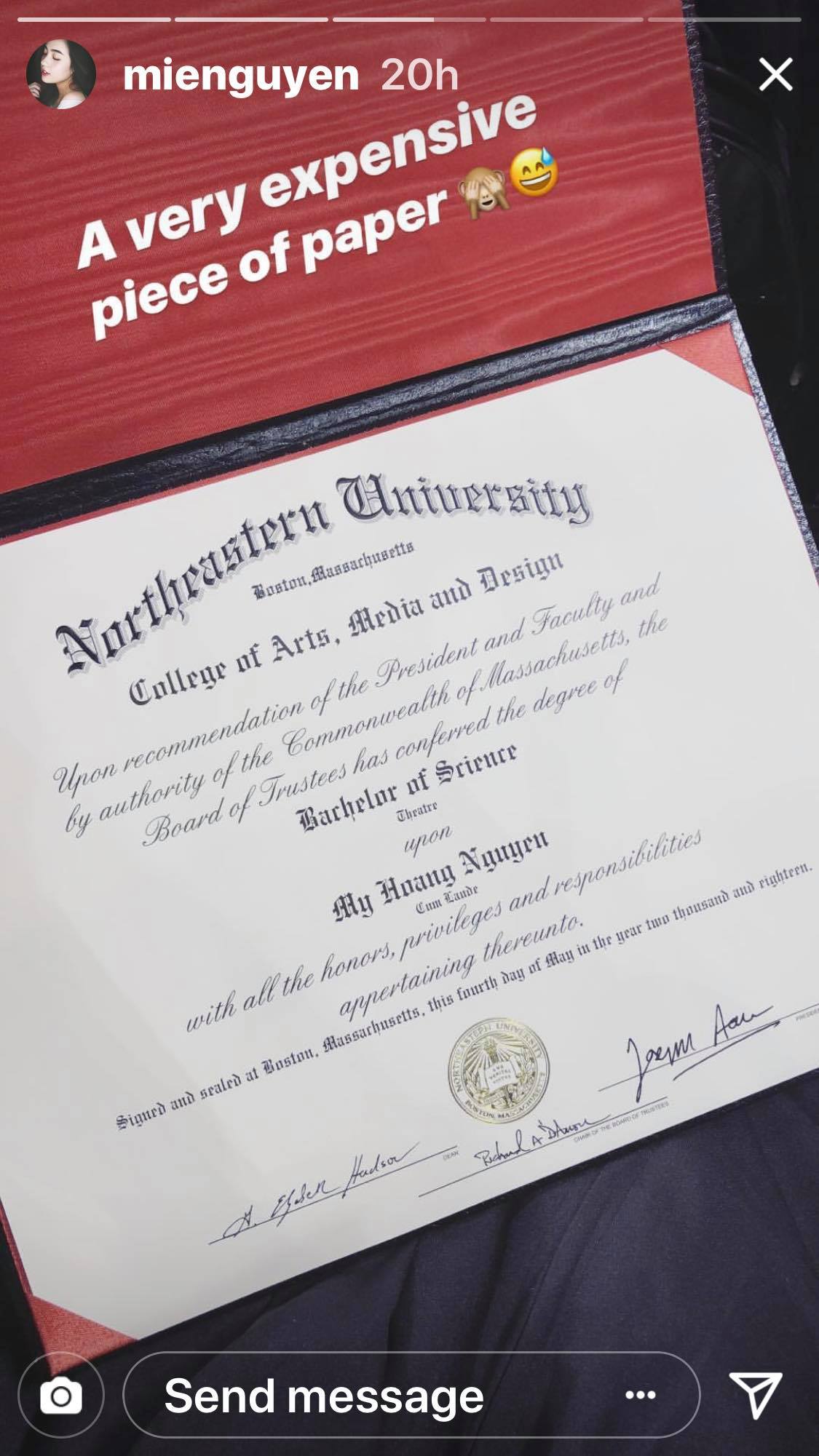 Mới đây, Mie đã tự hào khoe lên trang cá nhân tấm bằng tốt nghiệp danh giá của trường ĐH Northeastern (Mỹ). Cô viết: ”I made it! So blessed to have had this experience, thankful for a journey that brought me maturity, knowledge and the love of my life (Mình đã làm được! Cảm thấy rất biết ơn vì hành trình này, bởi nó đã cho mình sự trưởng thành, kiến thức và cả tình yêu trong đời)”.