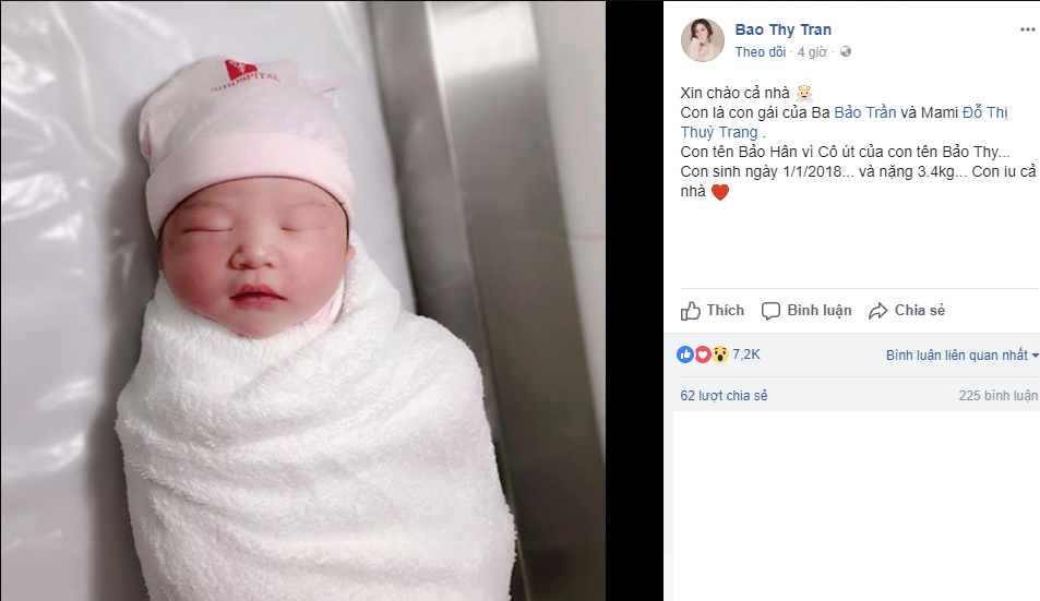 Bảo Thy viết: ”Xin chào cả nhà. Con là con gái của Ba Bảo Trần và Mami Đỗ Thị Thùy Trang. Con tên Bảo Hân vì cô út của con tên Bảo Thy… Con sinh ngày 1/1/2018… và nặng 3.4kg… Con iu cả nhà”.