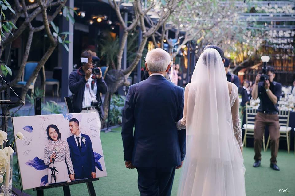 Bữa tiệc cưới diễn ra trong một không gian ngoài trời đem lại cảm giác trẻ trung và gần gũi. Tại hôn lễ, Giang Ơi được cha dẫn tay vào lễ đường, cô đã rơi nước mắt khi đọc lời thề và trao lời nguyện ước tới “chàng trai năm ấy” nay là bạn đời của mình.