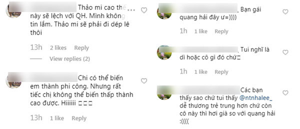 Trước đó, tình huống này cũng diễn ra tương tự với người yêu tin đồn cũ của nam tiền vệ. Hotgirl Sài thành Thảo Mi cũng từng bị dân tình tấn công bình luận như vũ bão khi vướng phải tin đồn hẹn hò với Quang Hải. Không ít những bình luận khiếm nhã xuất hiện trong các bài đăng của cô cả trên Instagram lẫn Facebook, cho rằng nang hot girl là “kẻ thứ ba” khiến cho mối tình giữa Quang Hải và Nhật lê rạn nứt. Quá đáng hơn, một số dân mạng còn cho rằng cô chỉ mượn danh Quang Hải để PR cho bản thân và thúc đẩy công việc kinh doanh của mình.