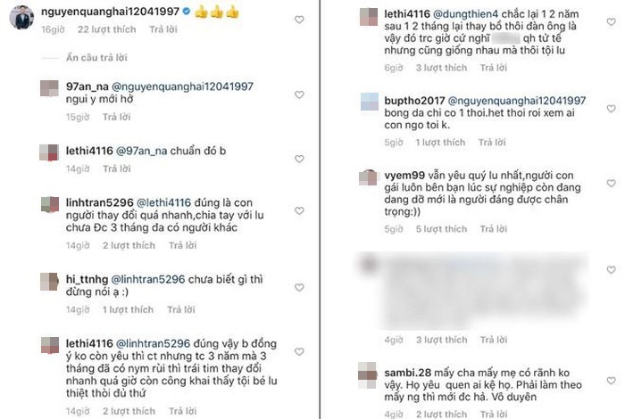 Dưới bài đăng mới nhất của hotgirl Hà thành, Quang Hải có tương tác bằng một biểu tượng “like”. Các anti-fan đi qua đã không quên để lại những bình luận tiêu cực vào phần trả lời comment của Quang Hải, nội dung có nhắc tới người yêu cũ Nhật Lê và quở trách nam cầu thủ thay lòng quá nhanh khi chỉ vừa chia tay bạn gái 3 thán đã có tình mới. Một vài người hâm mộ thấy vậy cũng không khoanh tay đứng nhìn mà ngay lập tức bình luận bênh vực chàng tiền vệ CLB Hà Nội. Trước áp lực từ dư luận, Quang Hải đã không thể im lặng mà phủ nhận tin đồn với người đẹp sinh năm 1998 ngay sau đó.